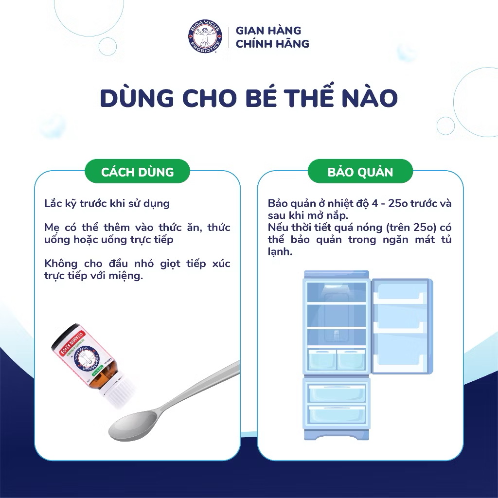 👉 Nhỏ trực tiếp vào miệng bé hoặc pha cùng sữa/nước theo hướng dẫn.
